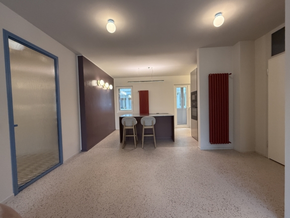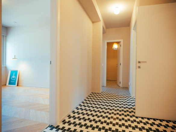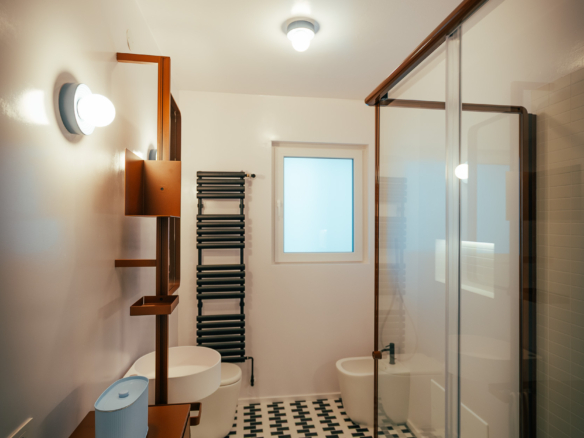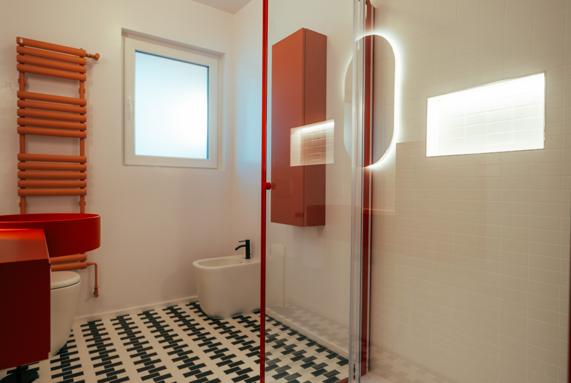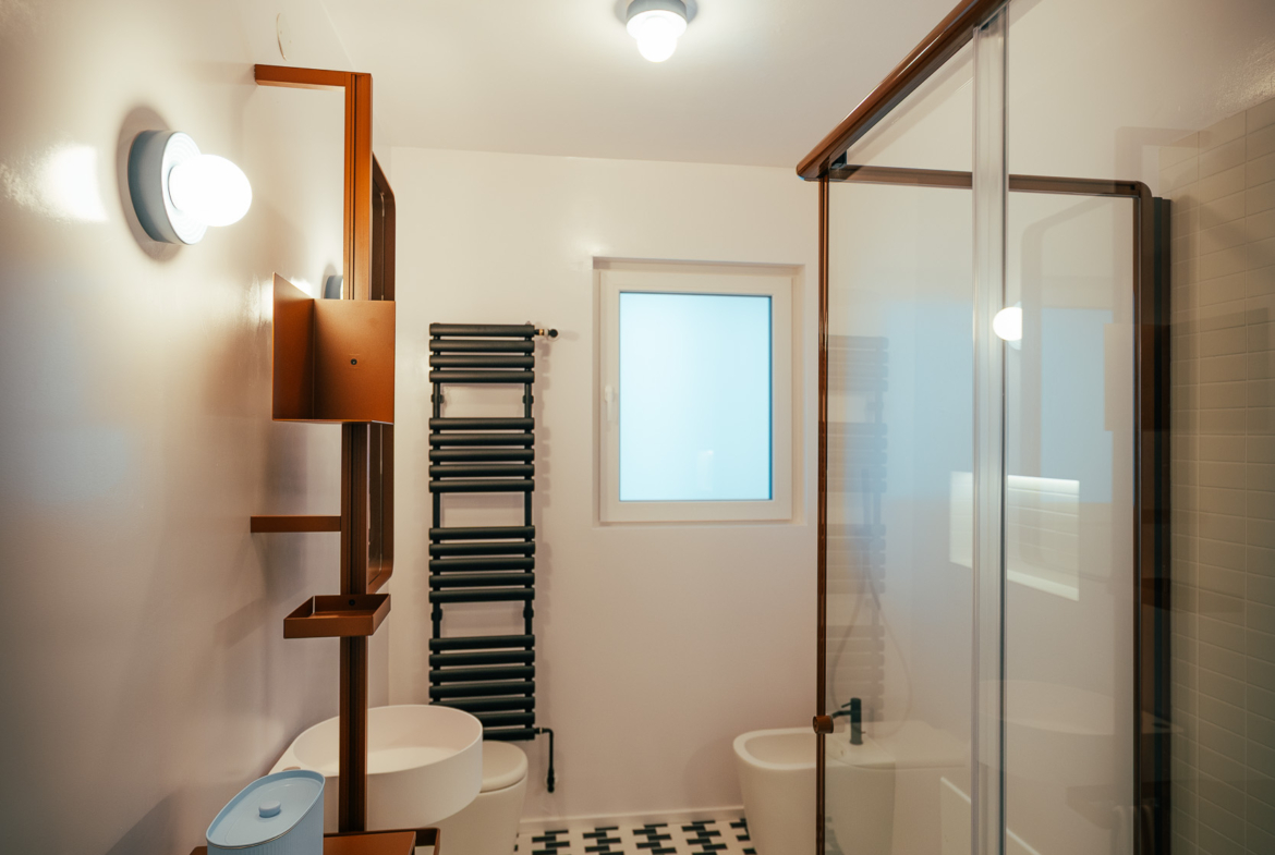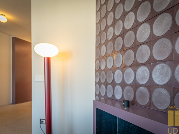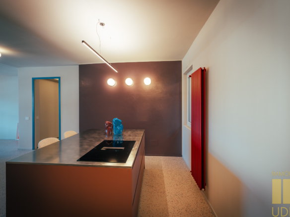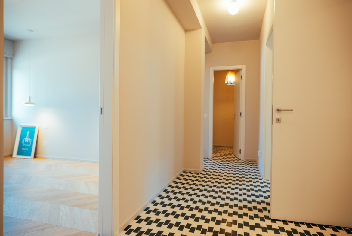 La zona giorno è un ampio open space inondato di luce, dove la pregiata resina francese (stile seminato veneziano) dialoga con arredi iconici, cromatismi studiati e decisamente affascinanti. La zona notte offre tre camere matrimoniali con pavimenti in legno con posa a spina di pesce, mentre il disimpegno notte e i bagni conservano il fascino ricercato di piastrelle che richiamano la storicità degli anni ’70.