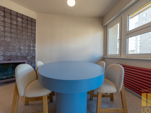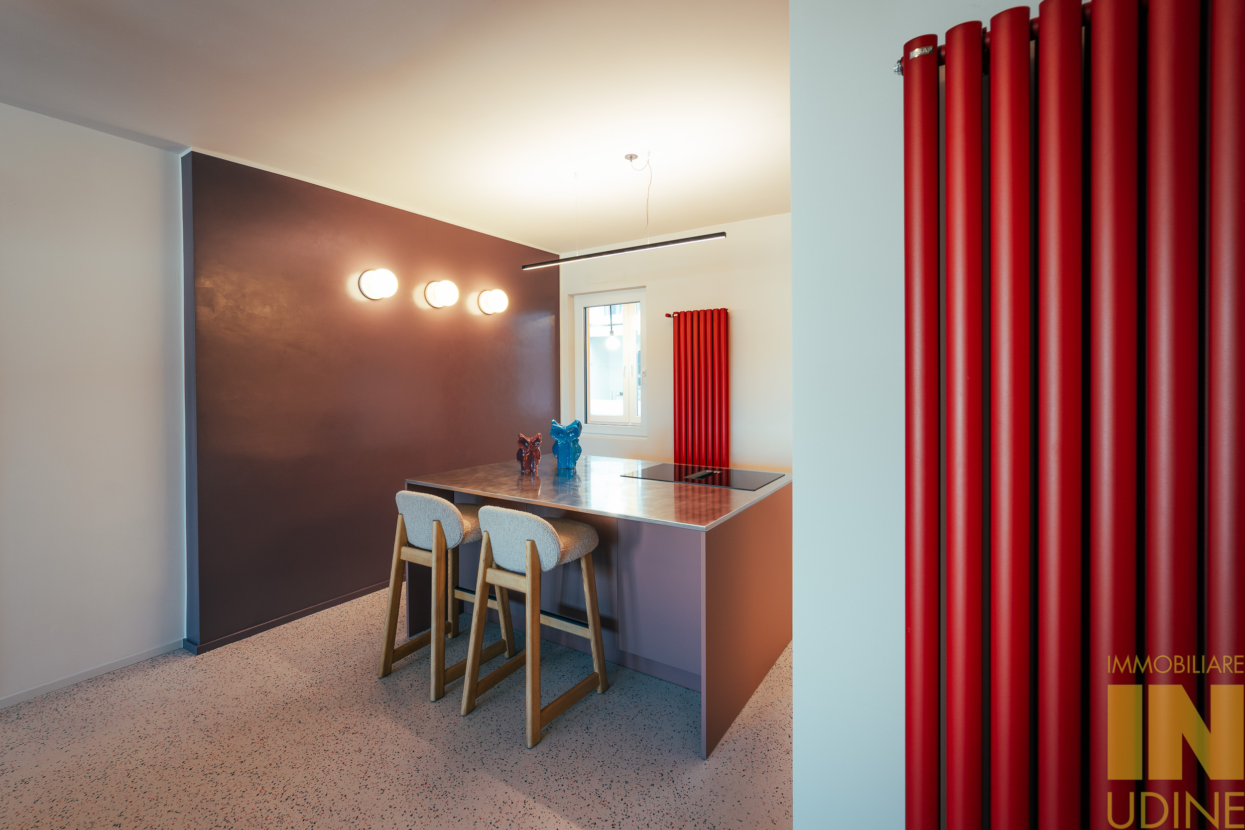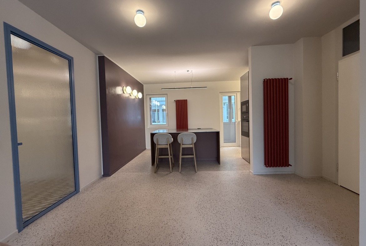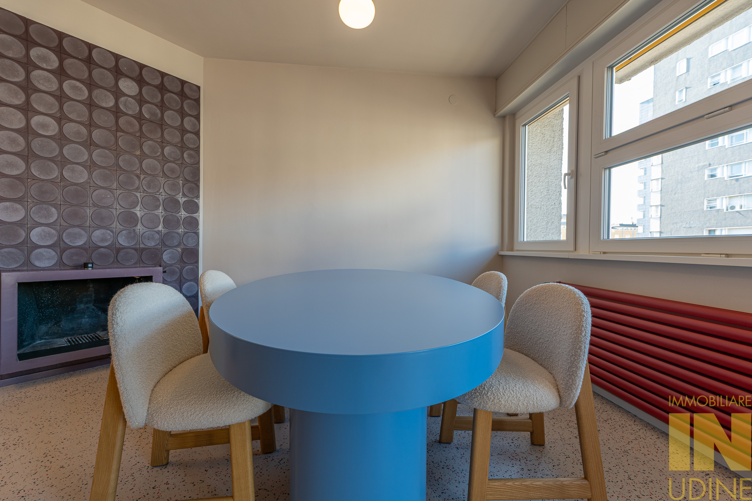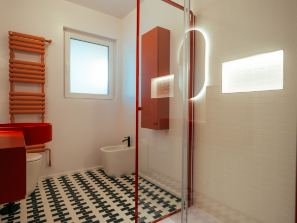 La zona giorno è un ampio open space inondato di luce, dove la pregiata resina francese (stile seminato veneziano) dialoga con arredi iconici, cromatismi studiati e decisamente affascinanti. La zona notte offre tre camere matrimoniali con pavimenti in legno con posa a spina di pesce, mentre il disimpegno notte e i bagni conservano il fascino ricercato di piastrelle che richiamano la storicità degli anni ’70.