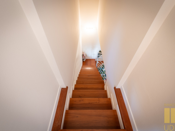 Lo sviluppo prevalente è al piano primo dove si trova la zona giorno composta da ingresso, cucinotto con terrazzino, soggiorno/pranzo con ampia vetrata affacciata sul terrazzo abitabile, e parte della zona notte con camera singola e matrimoniale ed un bagno con doccia finestrato.