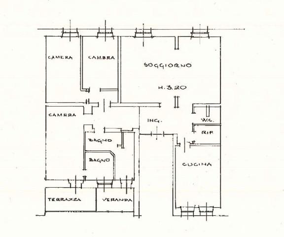 Questo appartamento presenta: comodo ingresso, cucina abitabile, bagno di servizio, ampio soggiorno, due camere singole, una camera matrimoniale con bagno padronale con vasca, ulteriore bagno con doccia. Dalla camera matrimoniale si accede ad una bella terrazza, in parte verandata, dove trova ubicazione la caldaia.